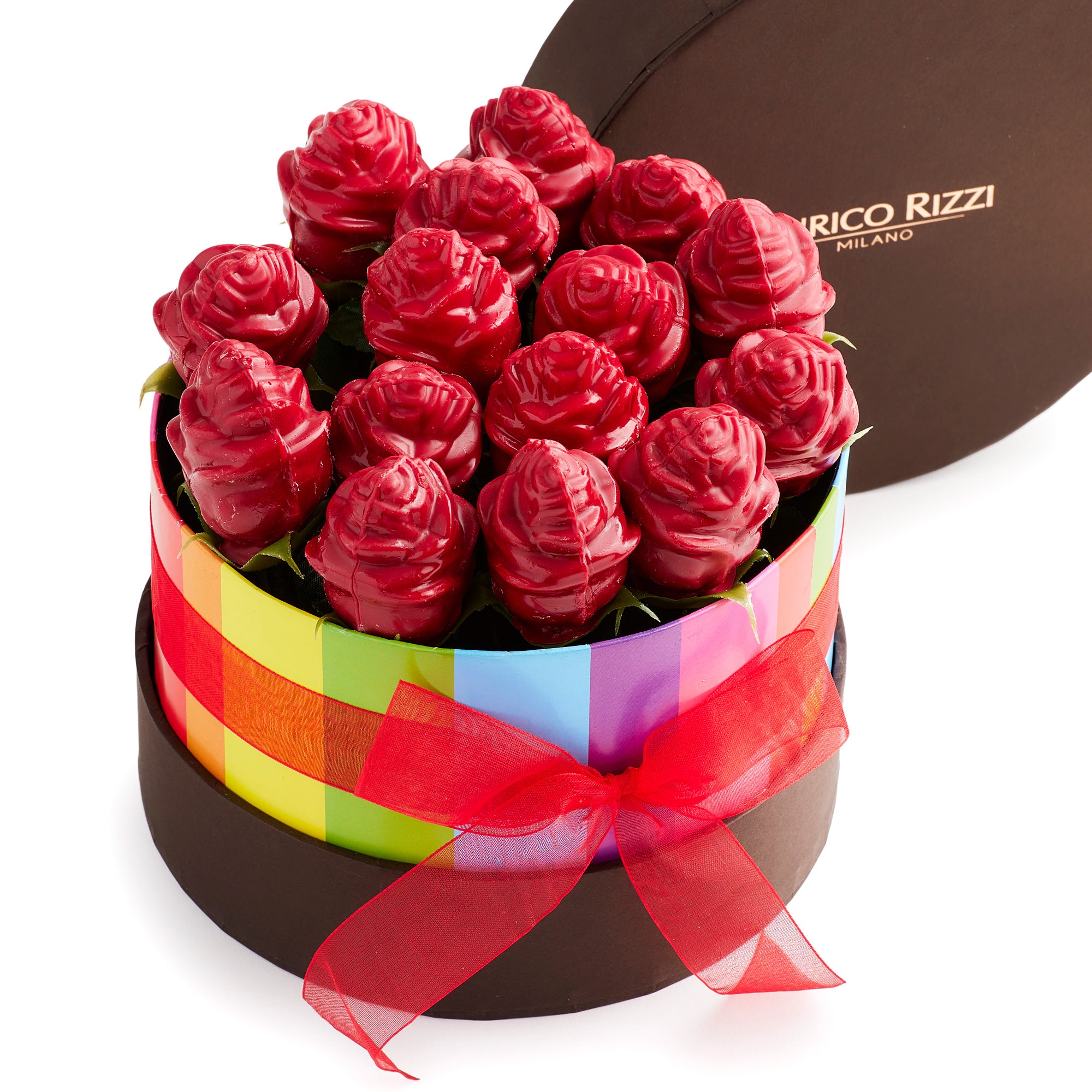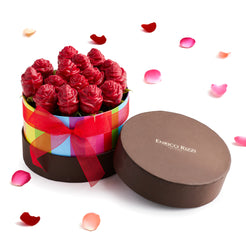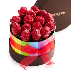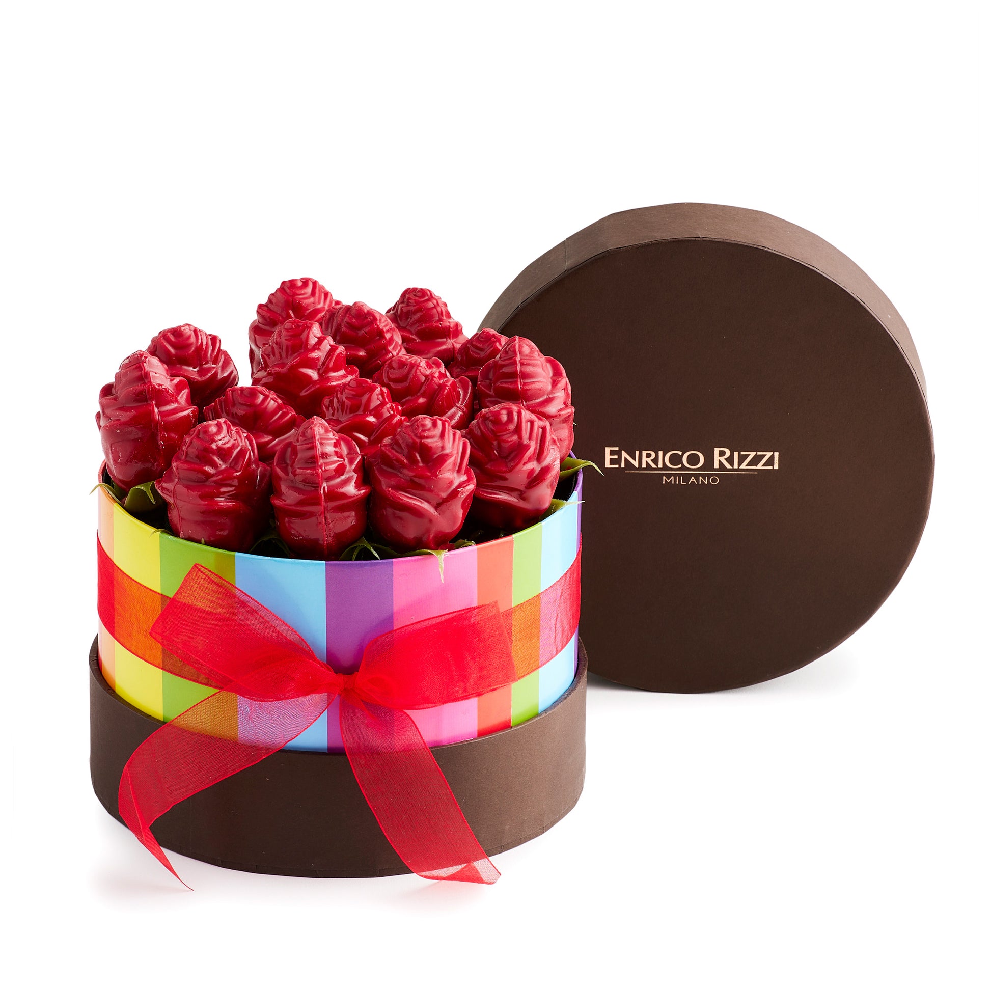 Cappelliera con 15 rose rosse. Petali in cioccolato alla rosa di Damasco.