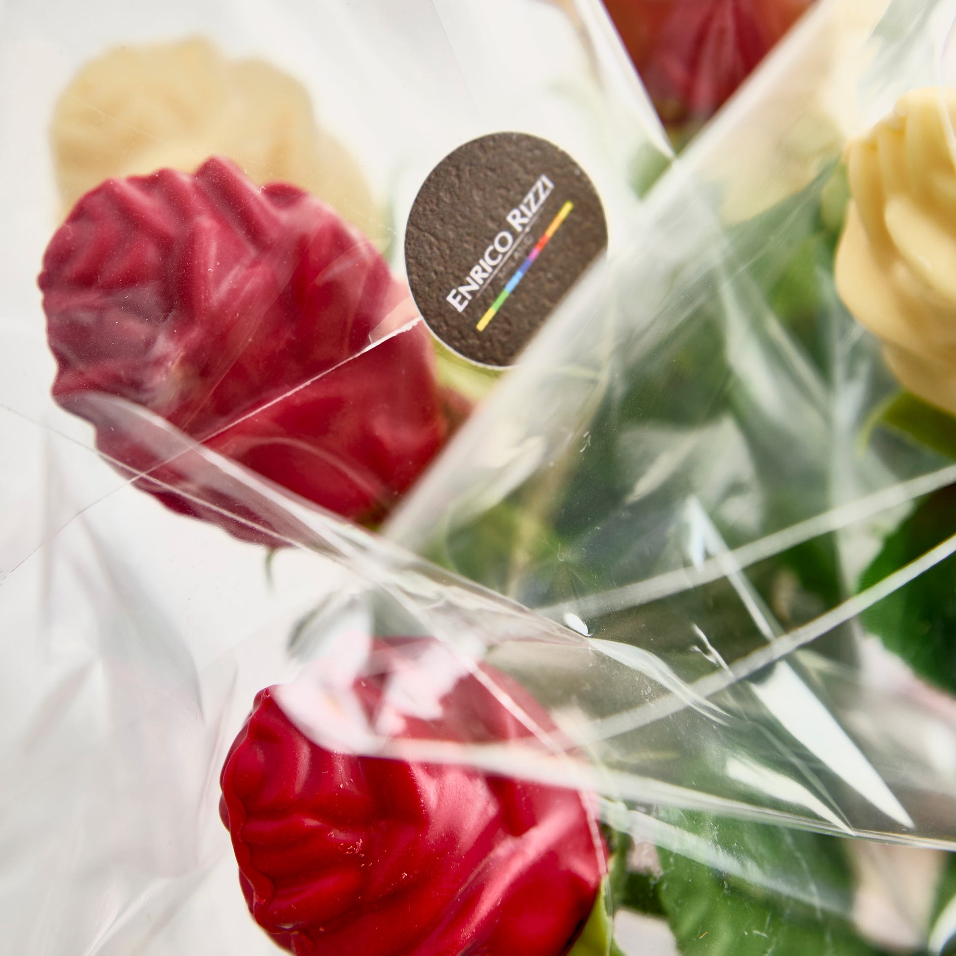 Rosa rossa con petali di cioccolato alla rosa di Damasco con incartato trasparente e fiocco