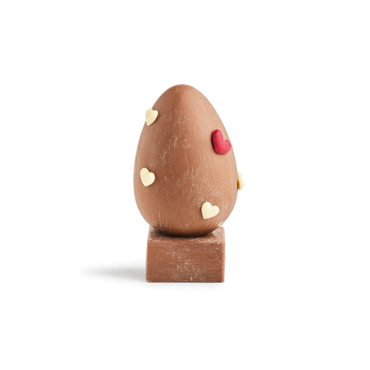 Un grande classico della collezione: cuori rossi e bianchi bombati, poggiati su un guscio di cioccolato al latte spazzolato